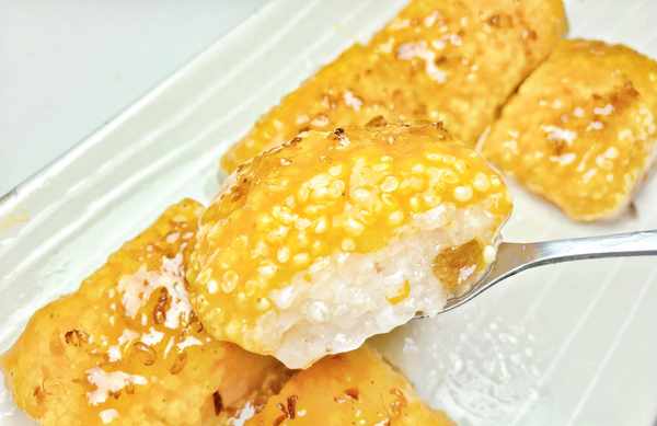 8、切成小块以后,淋上适量糖桂花就可以开吃啦,炎热的夏天来上一口,冰冰凉,糯叽叽,特别解暑,爱吃的朋友快动手试试吧!