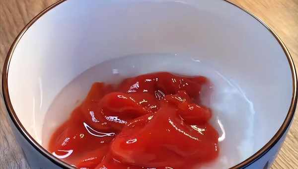 5、 准备一个小碗,加入两勺白糖,盐和多多的番茄酱,加清水搅匀备用。