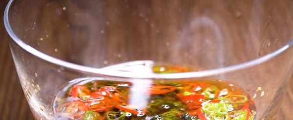 4、 锅内放油,烧至八成热时放入藤椒、辣椒圈,快速翻炒几下捞出,放入调味碗中。