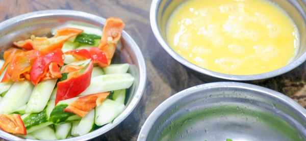 洗净的黄瓜一根,先切成长条,斜刀切成段,红椒一个切成菱形片,小盆里面打入4个鸡蛋,加入少许食盐,香醋1克,然后用筷子搅匀打散,小葱一根切成葱花,放入小盆里面。