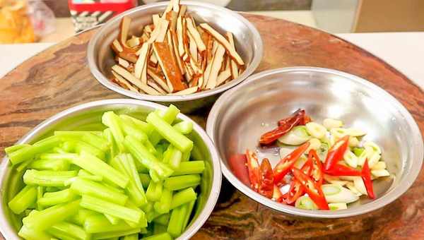 洗净的芹菜一把切成段,豆腐香干二两左右切成细条,大葱半根切成马蹄片,蒜子几粒切成蒜片,红线椒去掉根部切成斜片,和葱蒜放在一起,再放入几粒红干椒备用。