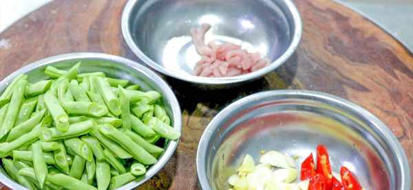 四季豆一斤左右,先去掉头尾,择去上面的老筋,再斜刀切成三厘米长的段,放入小盆中备用,提前切好的肉丝一份备用,蒜子几粒切成蒜片,红泡椒一个切成斜片,生姜一块切成姜片,一起放入盆中备用。