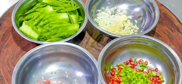 准备苦瓜两根,先从中间切开,一分四半,再片去内瓤,斜刀切成薄片,放入盆中备用,准备猪肉一小块,先切成薄片,再剁成肉末,放入小盆中。