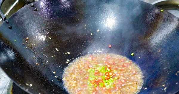 另起锅添入一勺食用油,充分滑锅后倒出,再添入半勺食用油,倒入肉末快速翻炒,热锅凉油食材不容易粘锅,炒至肉末变色以后,倒入葱蒜末爆香。