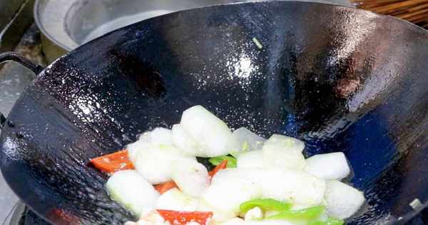 起锅烧水加入少许植物油,水烧开后离火,下入虾仁,再上火煮30秒,即可捞出放入盆中备用。等水再次烧开后,下入冬瓜和青红椒,用勺子翻动几下,焯水1分钟,倒出控水过凉。