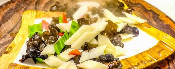 准备淮山药半根,削去外皮,切成菱形片,准备一把木耳提前用温水泡开,青椒半个切成菱形片,红椒半个同样切成片,蒜仔几个切成蒜片,生姜切成姜片,一起放入盆中备用。