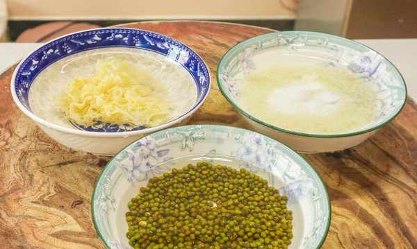 拿一个大碗,放入绿豆100克,加入适量的清水,洗净后浸泡两个小时,银耳一小块放入碗中,也加入清水浸泡两个小时,大米一小把放入碗中,同样浸泡两个小时,把银耳捞出来切成小朵备用。