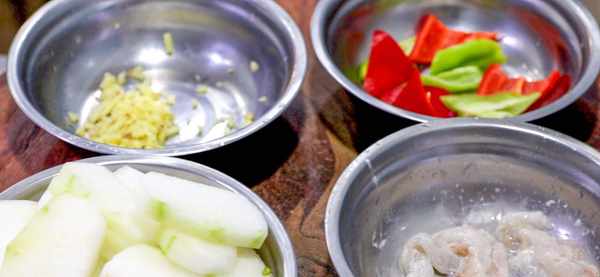 冬瓜半个,切成3毫米厚的薄片,红椒半个切成三角块,青椒半个同样切成块,剥好的虾仁4个,从背部片开,去除虾线,放入另一个盆中,加入少许料酒,抓拌均匀,再抓入少许玉米淀粉拌匀,生姜一小块切成姜沫,放入小盆中备用。