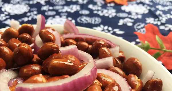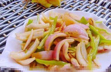 洋葱去老皮洗干净,切成粗条备用;花生挑去杂质,入油锅炸至酥脆即可。