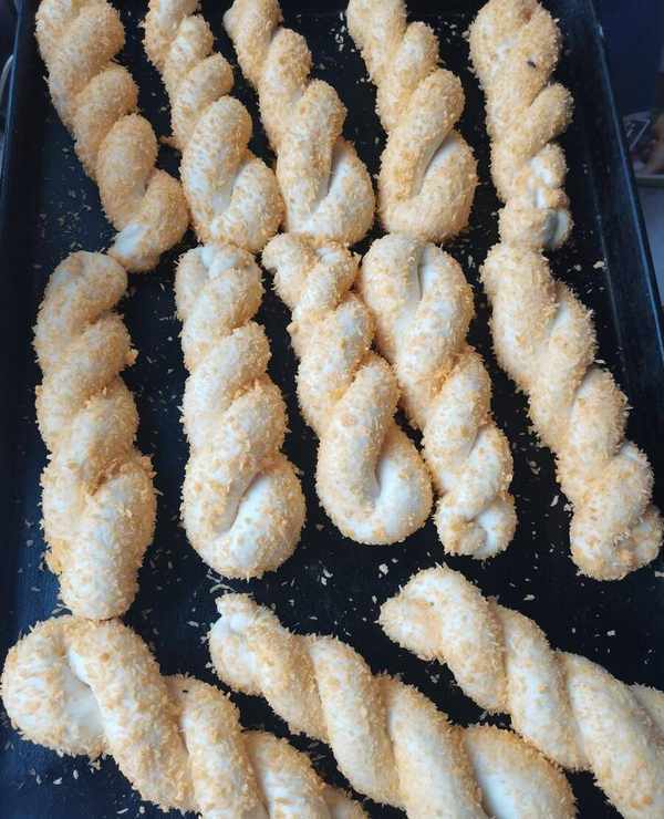 之后将长条的面团拧成麻花状,再发酵30分钟,等到麻花明显膨胀,然后在表面裹上一层面包糠。