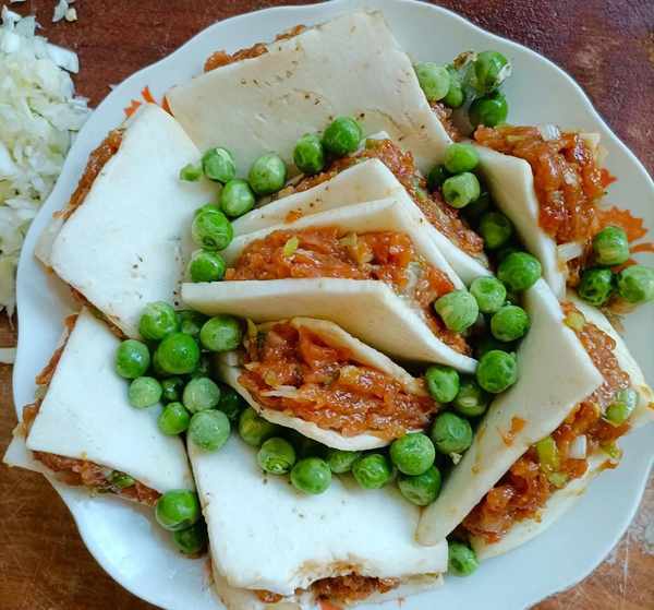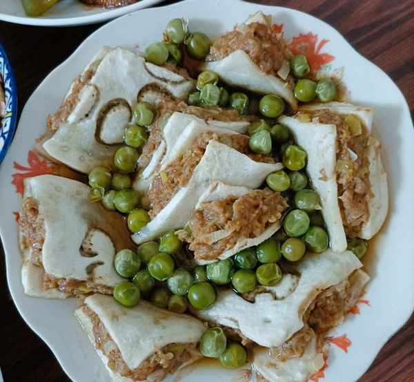 把肉馅装进茄子片里,夹好放进盘子里,缝隙里撒上豌豆装饰。