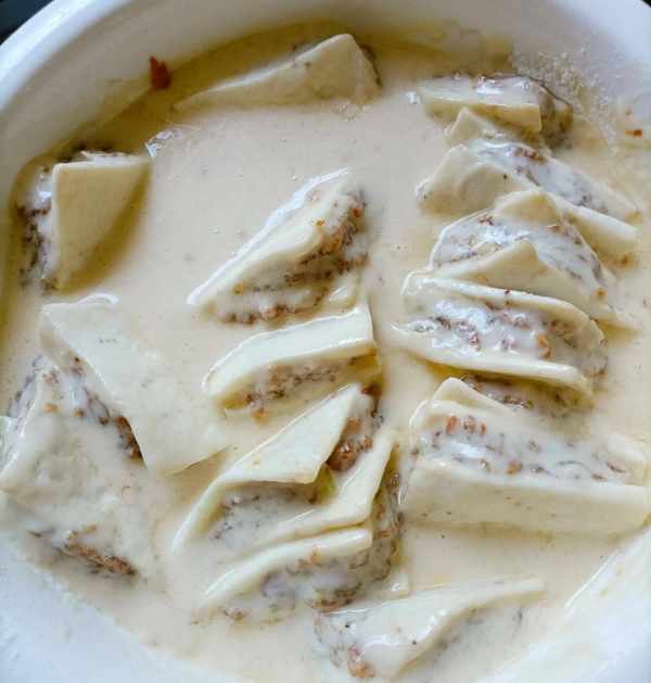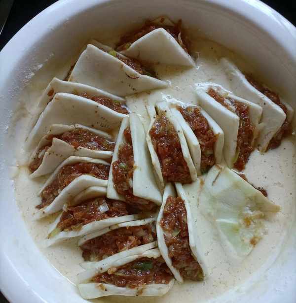 蒸的同时继续把肉馅装进茄子里,放进提前调好的面糊里,面糊里放进一个鸡蛋调匀。