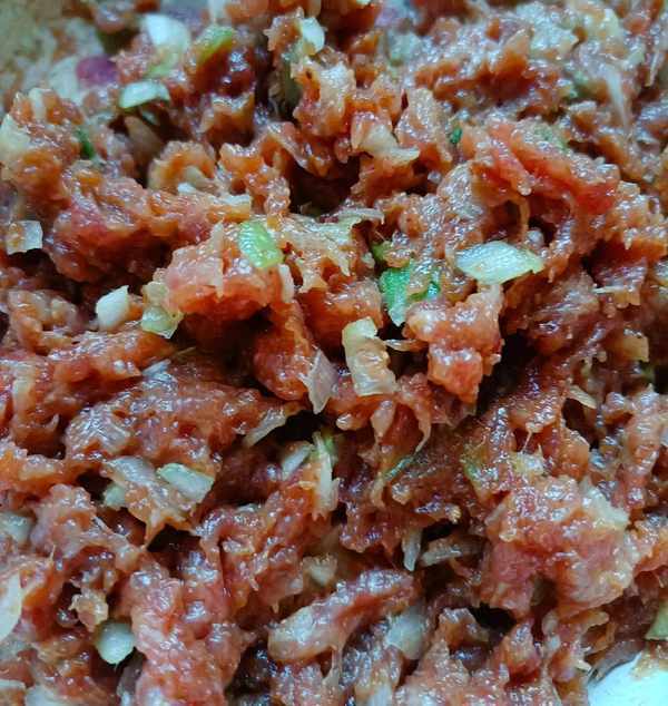 把肉洗好打成肉馅,加香油猪油老抽生抽等调料拌好备用。