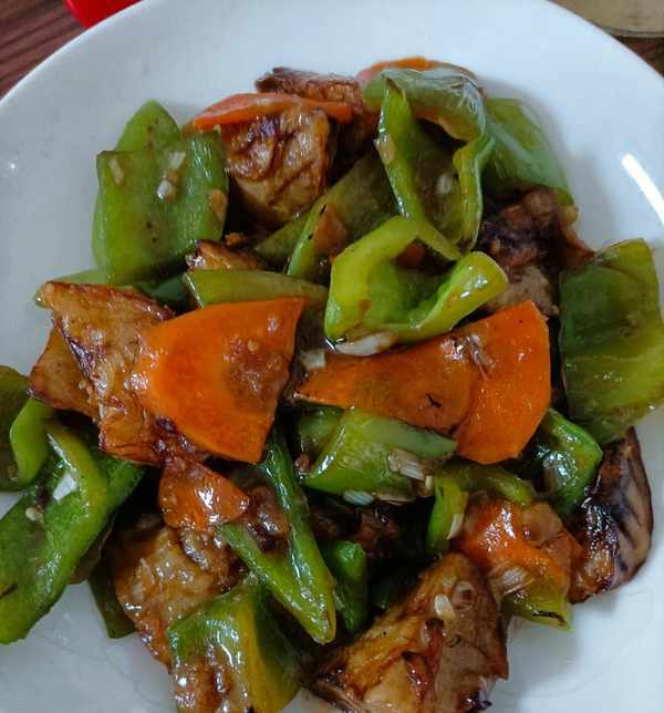 第三种,炸后炒,茄子切成块,先炸好,配了胡萝卜,辣椒一起炒,反映有点油腻,味道不错。