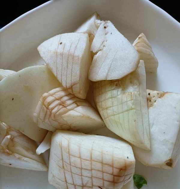 茄子洗净去皮切成四瓣,每瓣继续切成两两相连的三角块儿。