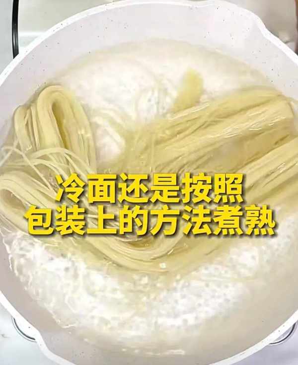第三步:把冷面用冷水泡10分钟,再下锅,锅中倒水放入冷面(注意一定要是冷水下锅),边煮边用筷子搅散,煮熟透之后过冷水,把煮白的面汤洗掉(或是按包装上的煮法)