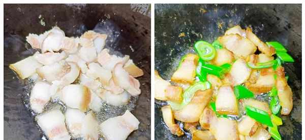 ④热锅冷油,倒入五花肉干煸。待五花肉的油脂炒出来后盛一点油出来。加入1勺料酒去腥,再倒入生抽提鲜。翻炒均匀后放入葱白增香去腥,爆炒几下。
