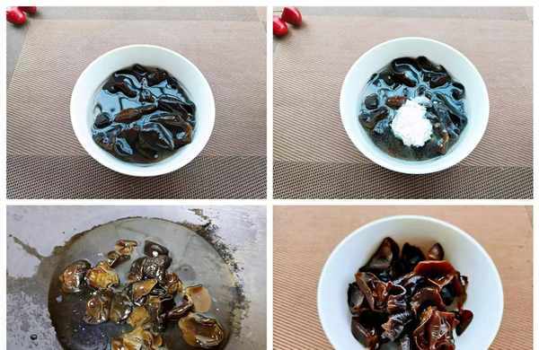 ③我们把干木耳放入碗中,加水没过。待木耳泡发好后倒入1勺面粉,揉搓一会儿。锅中烧水,水开后倒入木耳焯水。约1分钟左右捞出木耳,过冷水,冲洗干净。