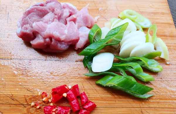 ②猪前腿肉洗干净后切片,葱、小米椒洗干净切成碎末。