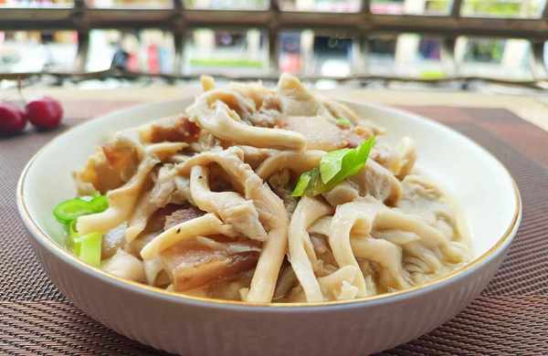 食材:平菇400克、五花肉100克、葱、姜、料酒、生抽、食用油、盐
