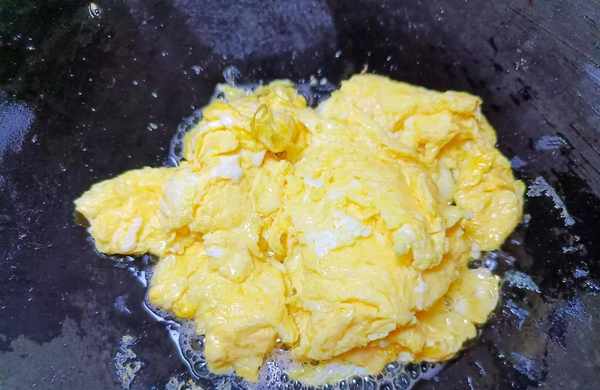 ④倒入鸡蛋,大火快炒几次。加入盐调味,继续翻炒一会儿。