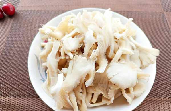 ①我们把平菇的根去掉,泡入水中5分钟。清洗干净后挤干水分,撕成小块放入盘子中。