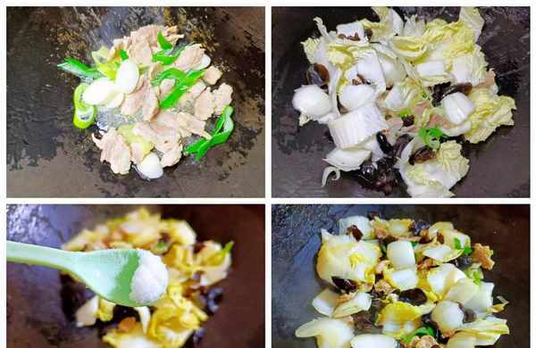 ④热锅冷油,倒入肉片煸炒。待肉片变色后,加入生抽、料酒去腥。大火爆炒几下,放入葱白去腥,继续爆炒几下。倒入木耳和白菜,继续爆炒。待白菜表面有点透明时,加入一点盐和1勺生抽,继续爆炒。