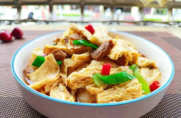 食材:腐竹150克、葱、小米椒、生抽、老抽、料酒、盐、食用油、白糖、猪前腿肉