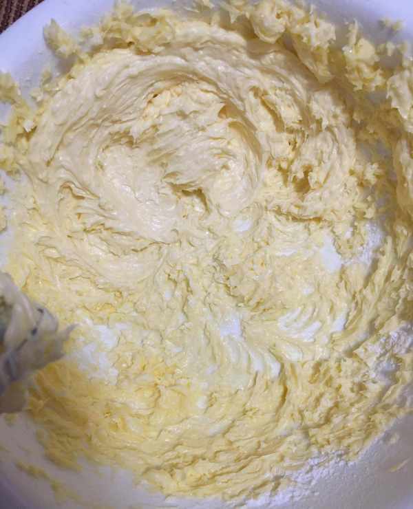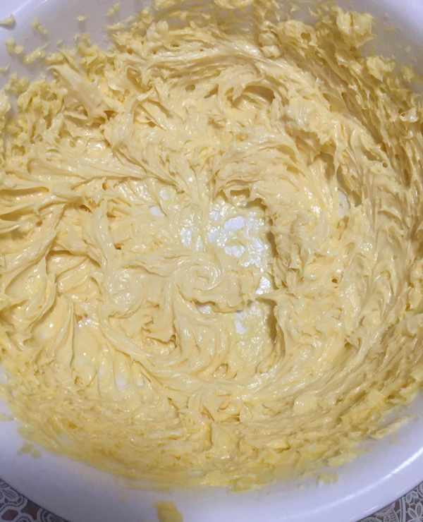 3、分三次加入打散的鸡蛋液,每一次都打至鸡蛋液与黄油充分融合,再加入下一次蛋液,打至黄油体积蓬松,略微发白,类似奶油霜状。