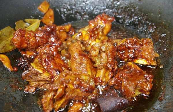 4、锅中加入适量的食用油,先把冰糖放进锅中,小火慢炒,炒至冰糖融化且颜色呈枣红色即可。