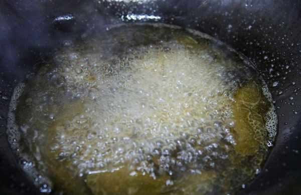 3、冰糖下锅后小火慢炒,炒至融化,颜色发暗红即可。