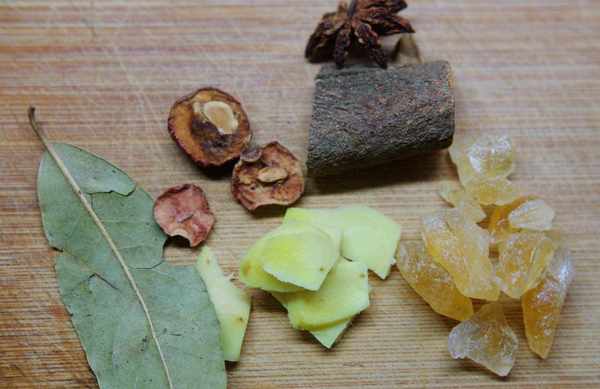 3、开始准备酱大骨需要的香辛料:10g冰糖、1个八角、1块桂皮、5g生姜、2颗山楂、1片香叶即可。(这些调料是按照600g大骨准备的,大家根据自己准备的大骨量适当增添或者减少即可。)