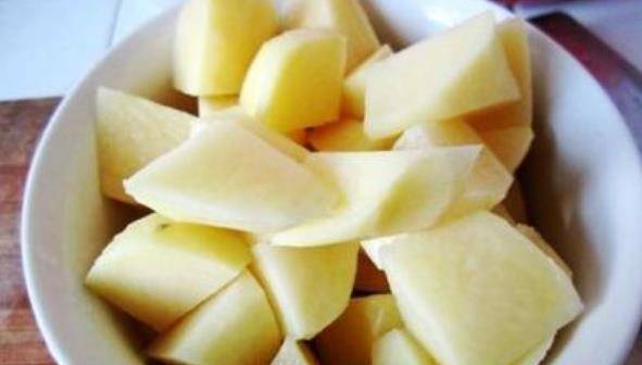 第一步,土豆去皮切块。先把土豆清洗干净,削去外皮,对半切开,再切成小块,放入碗中,洗净多余的淀粉,控干水分备用。