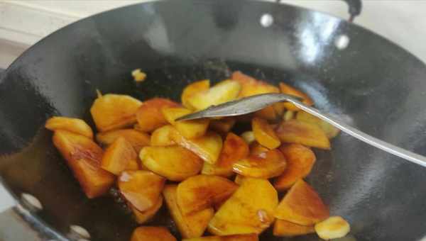 第三步,加入土豆。接着,再把土豆加进来,翻炒至土豆断生,加入生抽2勺,老抽1勺上色均匀。