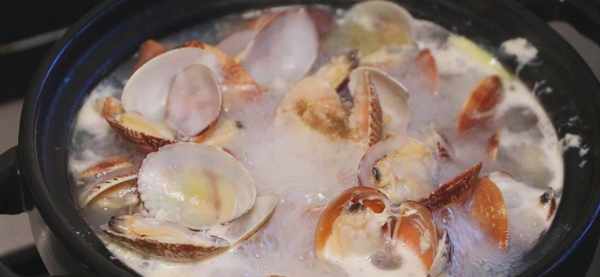 步骤④:这时候我们把花甲倒进来,然后倒入淹没花甲的开水,盖上盖子转中火焖3分钟,3分钟后可以看到花甲都开口了,这时候在来调味,加入一点胡椒粉和一小勺盐,最后在把香菜放进来就完成了。(记住加水的时候是加的开水,不要加凉水哦)