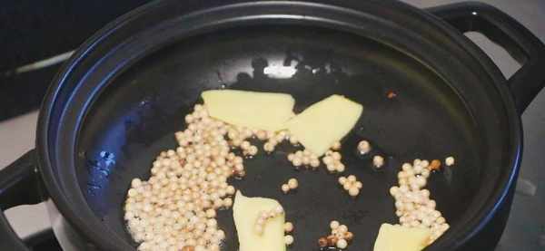 步骤③:准备一口砂锅,先把白胡椒粒放进来开小火翻炒,慢慢翻炒出它的香味,闻到浓郁的胡椒味后再加入一点食用油,姜片也放进来翻炒一会,这样可以起到去腥的作用。