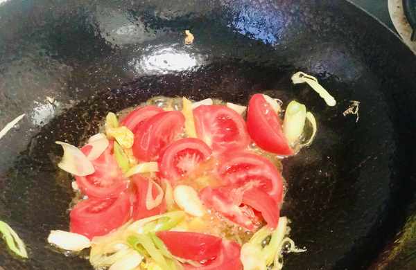 锅中无需再次加植物油,直接下入葱、蒜、番茄,加入食盐调味儿,除此之外,什么调味料都不要再添加!提前加入食盐可以更快地炒出番茄里边的汤汁!