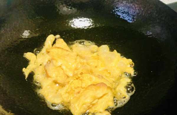 准备就绪,开始烹饪,锅中加入适量的植物油,油温五成热下入鸡蛋液,高温可以让白醋直接挥发,所以不用担心加了白醋会有酸味!喜欢吃老的可以多炒一会,喜欢吃嫩的定型之后就可以盛出来备用!
