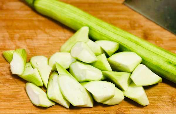 丝瓜的外皮一定要刮干净,否则吃起来口感不好,因为丝瓜里边的黏液非常的光滑,所以大家一定要小心点,别刮到手了!丝瓜的外皮刮干净之后,改刀切成滚刀块,这样子炒的时候更加容易入味儿。