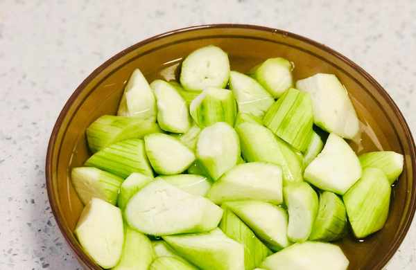 ps:有些朋友喜欢用盐水浸泡,盐水浸泡固然能够起到防止氧化的目的,但是也会让丝瓜的汁水流失,导致营养成分流失,所以不推荐用盐水浸泡!
