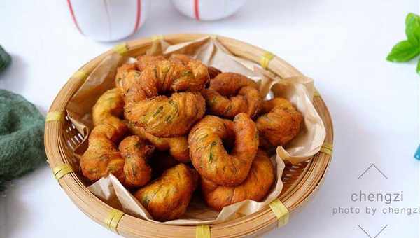 7、锅内加植物油烧至六成热,将茴香早点生坯放入锅中炸制,两面都炸至金黄色,控油捞出。