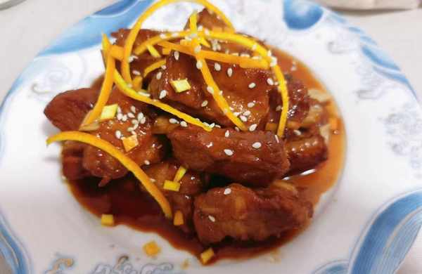 ⑨倒少许橙汁入锅,大火收汁,撒白芝麻和葱花出锅,加点橙皮丝和丁点缀装饰