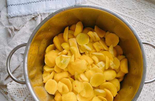 5、准备一个大一点的锅,我用的是一个深锅,这个锅需要提前清洗,为了能延长油桃罐头的保质期,这个锅一定不能有油渍,把浸泡在盐水中的油桃块放在锅中;