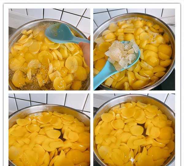 8、煮好之后关火出锅,刚煮好的油桃罐头颜色黄黄的,特别好看,趁热吃口感也不错,但是建议冷藏之后食用,冰冰凉凉酸酸甜甜,口感会更好;