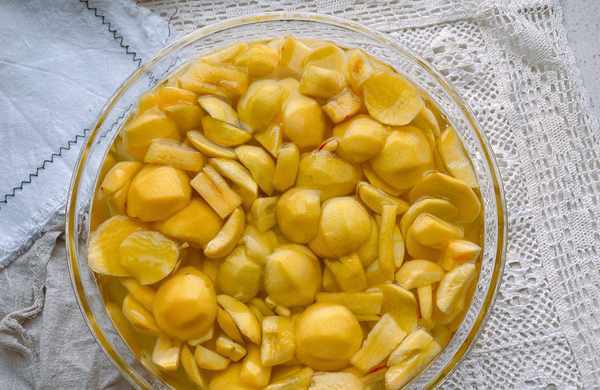 3、油桃果肉的颜色也是黄黄的,色泽很好看,和黄桃果肉的颜色很相似,在去皮的过程中避免油桃果肉氧化,可以把油桃果肉放在盐水中浸泡,还能起到再次清洗的作用;