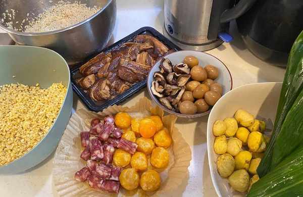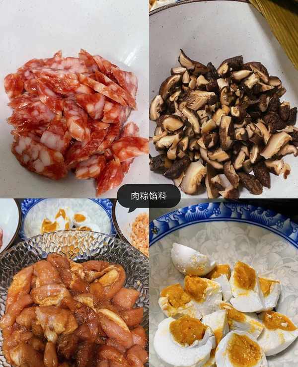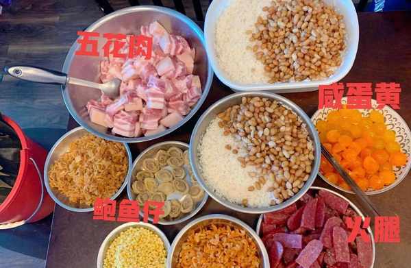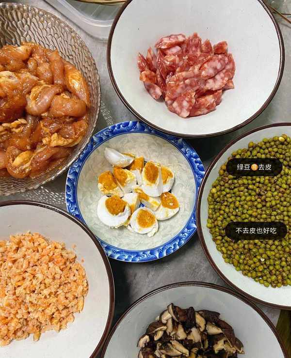 主要食材:糯米,绿豆,咸蛋黄,腊肠,五花肉,小虾米,冬菇,生抽,白糖,蚝油,糖,酱油,十三香,五香粉,花生油。