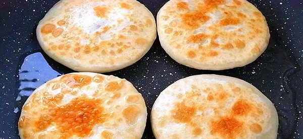 5.平底锅预热,倒入食用油,放入糖饼,糖饼上面刷油,转中小火开始烙饼,等下面的那层上色后,用铲子翻面,烙到两面都上色,糖饼中间鼓起来,就熟了,出锅。
