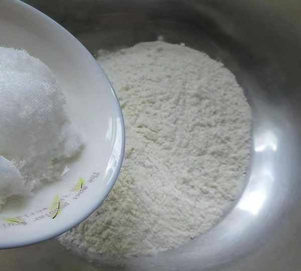 3.下一步我们来调白糖馅料:以三比一的比例,在碗中放入白糖和面粉,用勺子搅拌均匀,也可以根据自己的口味随意调整;白糖里加入面粉是为了防止糖遇热后往外流;