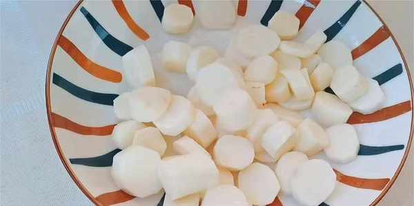 步骤一:山药洗净切成小段,雪梨洗净削皮以后切小块,小米淘洗一下,不要搓洗,待用。