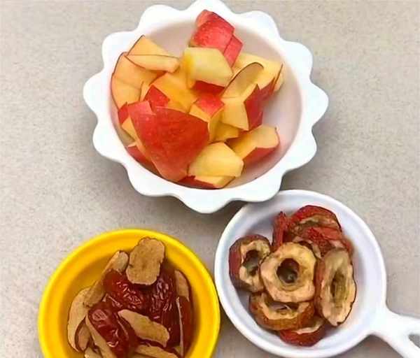 步骤一:一个苹果用盐搓洗干净,切成小块。几个山楂洗净去掉核,两个大红枣洗净去核,切成小块,待用。